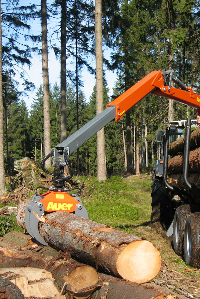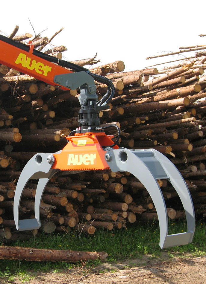 Durch die spezielle Schließgeometrie sind die Greifer stets ausbalanciert und hängen somit nicht schräg. Die Auer Holzgreifer können nahezu auf alle Kräne aufgebaut werden.